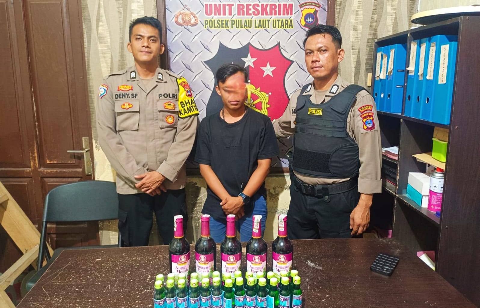 Selain seorang pelaku, polisi juga berhasil mengamankan barang bukti berupa puluhan botol alkohol gajah duduk, serta lima botol Miras jenis Anggur Merah alias Amer.
