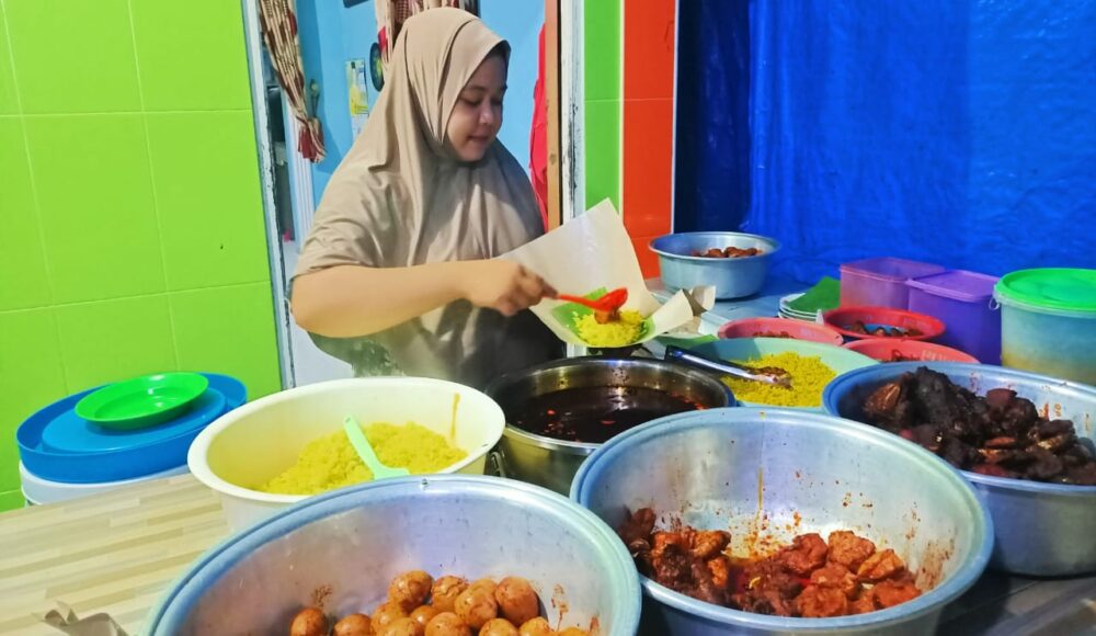 “Kalau keuntungannya itu bisa Rp3 juta sampai Rp5 juta lah dalam sehari,” ujar Rimayanti sembari membungkus nasi pesanan pelanggannya.