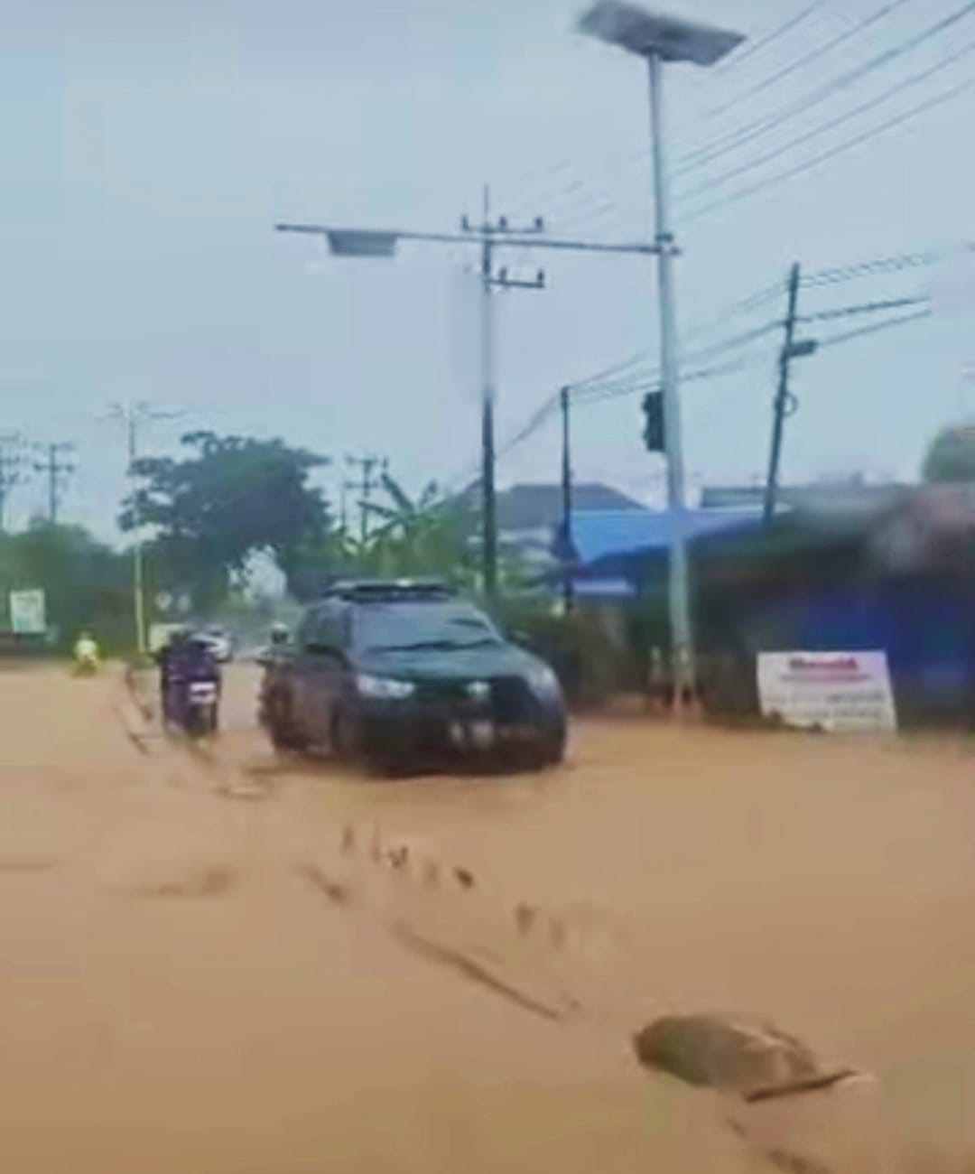 Akibatnya, sejumlah titik ruas jalan di pusat daerah berjuluk Bumi Saijaan tergenang alias kebanjiran.