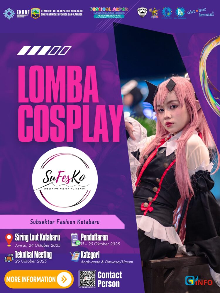 ADAINFO, KOTABARU – Subsektor Fesyen Kotabaru (SuFesKo), di bawah dukungan Pemkab Kotabaru melalui Disparpora bakal menyelenggarakan Lomba Cosplay.