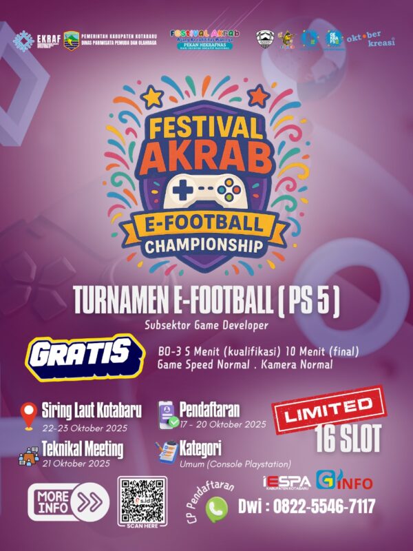 ADAINFO, KOTABARU – Memeriahkan Festival AKRAB 2025, Pemkab Kotabaru melalui Disparpora menggelar E-Football Championship kategori Umum (Console Playstation 5.