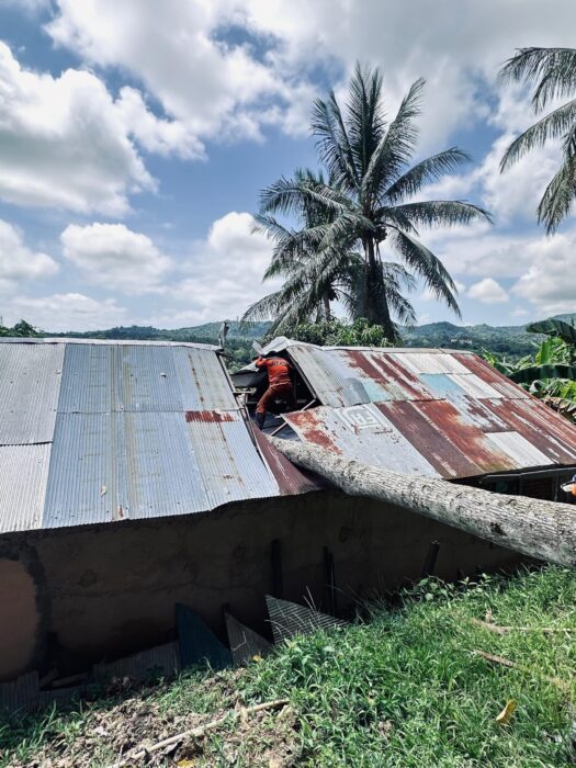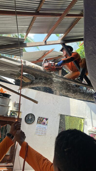 Begitu tiba di lokasi kejadian, petugas langsung mengerahkan peralatan lengkap, termasuk gergaji mesin (chainsaw), untuk membersihkan puing-puing dan reruntuhan batang pohon yang merusak bagian bangunan.